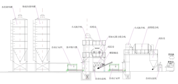 鄭州銘將機(jī)械設(shè)備有限公司生產(chǎn)的保溫砂漿設(shè)備主要是由提升機(jī)、預(yù)混倉(cāng)(可選)、小料倉(cāng)、混合機(jī)、成品倉(cāng)、包裝機(jī)、除塵器、電控柜、氣相平衡系統(tǒng)組成。采用雙軸無重力混合機(jī)。