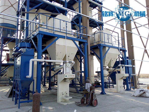 鄭州銘將機械設備有限公司研發生產的全自動保溫砂漿生產線,一般情況下會用到4-6個原料罐,兩個大罐用于裝放散裝水泥和粉煤灰,其余小罐用于裝放輕鈣、重鈣、砂、小料等。散裝水泥和粉煤灰進罐不需要提升設備,依靠泵車打入。輕鈣、重鈣、砂、小料等需要使用斗式提升機提入小罐,巧妙的物料分配系統支持一個斗式提升機分配式作業,從而避免了資源浪費。計量系統在計量螺旋的配合下,把料倉中的原料導入計量倉,通過傳感器的數據反饋,實現原料計量。計量好后的物料,通過螺旋輸送機導進主斗提機,提升到混合機上部待混料倉中。待混倉為氣動大開門型,可以迅速將待混物料放入無重力混合機,實現保溫砂漿連續生產。