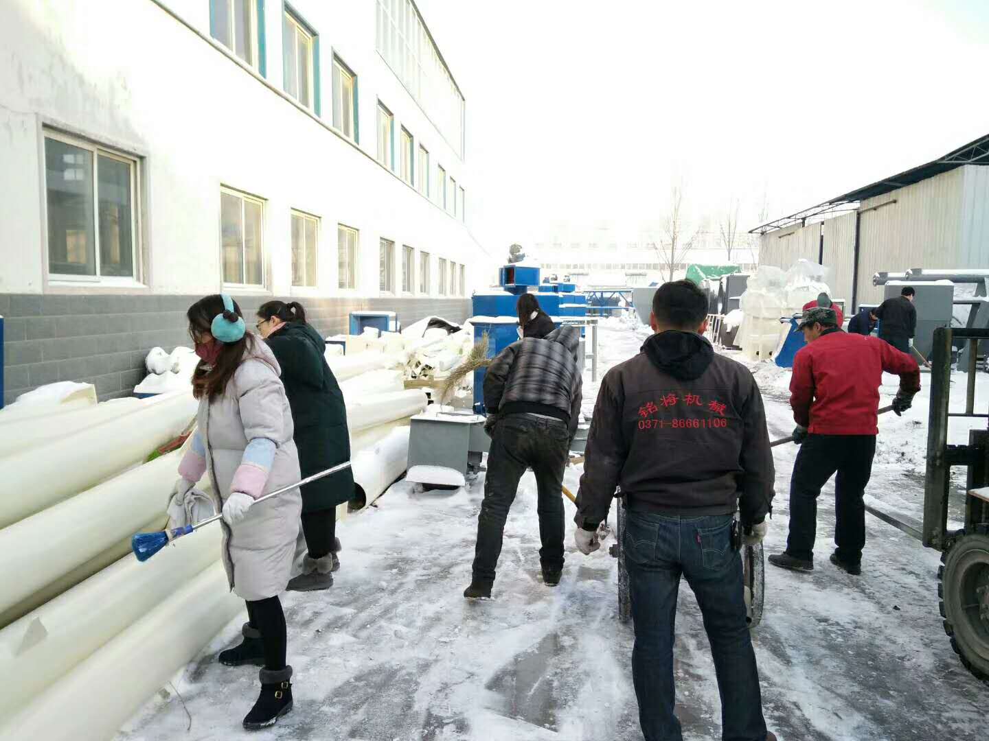 這場雪持續一天一夜,整裝待發的設備上蓋著厚厚的一層雪,為了不耽誤客戶的工期,正常發貨,一大清早銘將全體員工集體出動,清掃設備上的雪,大家不怕嚴寒,始終飽含工作熱情和高昂的斗志,有力的為塞爾維亞的正常發貨做好準備。